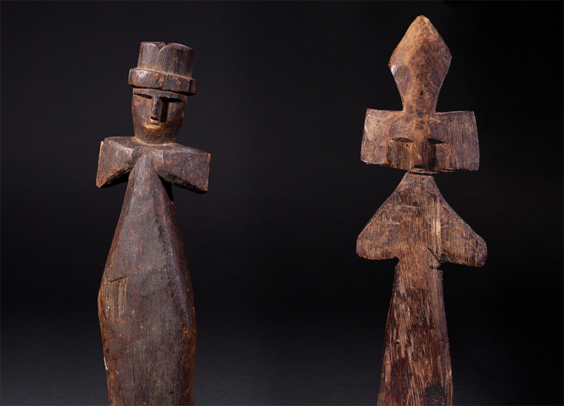 Relatively rare, Ina Suar are often flat with a cross shape, and sometimes have an anthropomorphic head. They are used in healing ceremonies.
