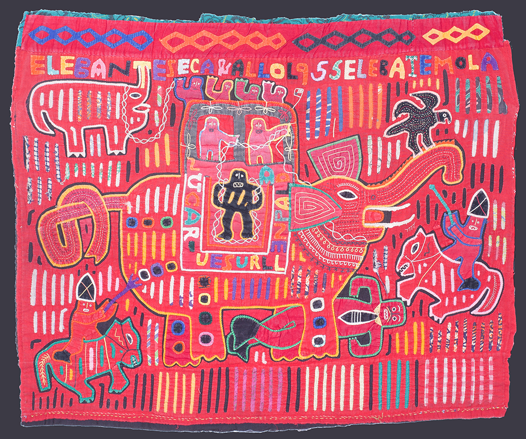 Mid-century molas commonly convey stories or specific figural images using precise cutting and sewing and a wide variety of colors. Molas of this period were often inspired by images from non-Guna sources, like magazines and labels.