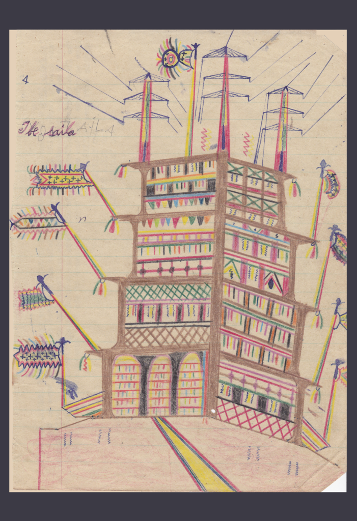 Drawing of “Ibe Saila Galu” (home of evil spirits). By Alfonso Dias Granada, senior Inadule of the Arquia, Colombia. The flags represent communications between earth and heaven like telephones from the mountain tops. Kapp. 1969. 6.25” x 8.5”